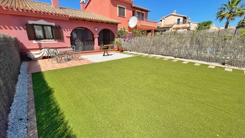 Large garden with artificial grass; charcoal BBQ, Dining patio with table and chairs, sun loungers; access to community pool from the garden; roof solarium